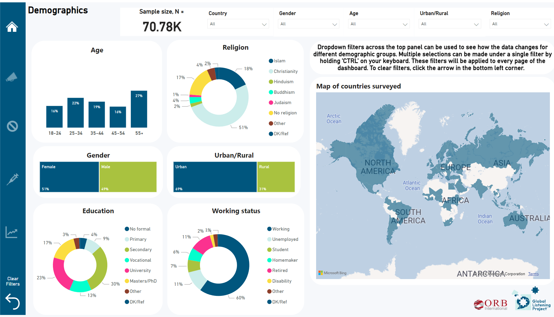 Our 70 country data provides useful insights into understanding how public trust in governments and health policies has been affected by the COVID-19 pandemic. This is the first data set of this size to capture comprehensive information about the experience during COVID-19, future outlook, and sense of preparedness for future emergencies. The tool supports analysis by gender, age, religion, and geography.